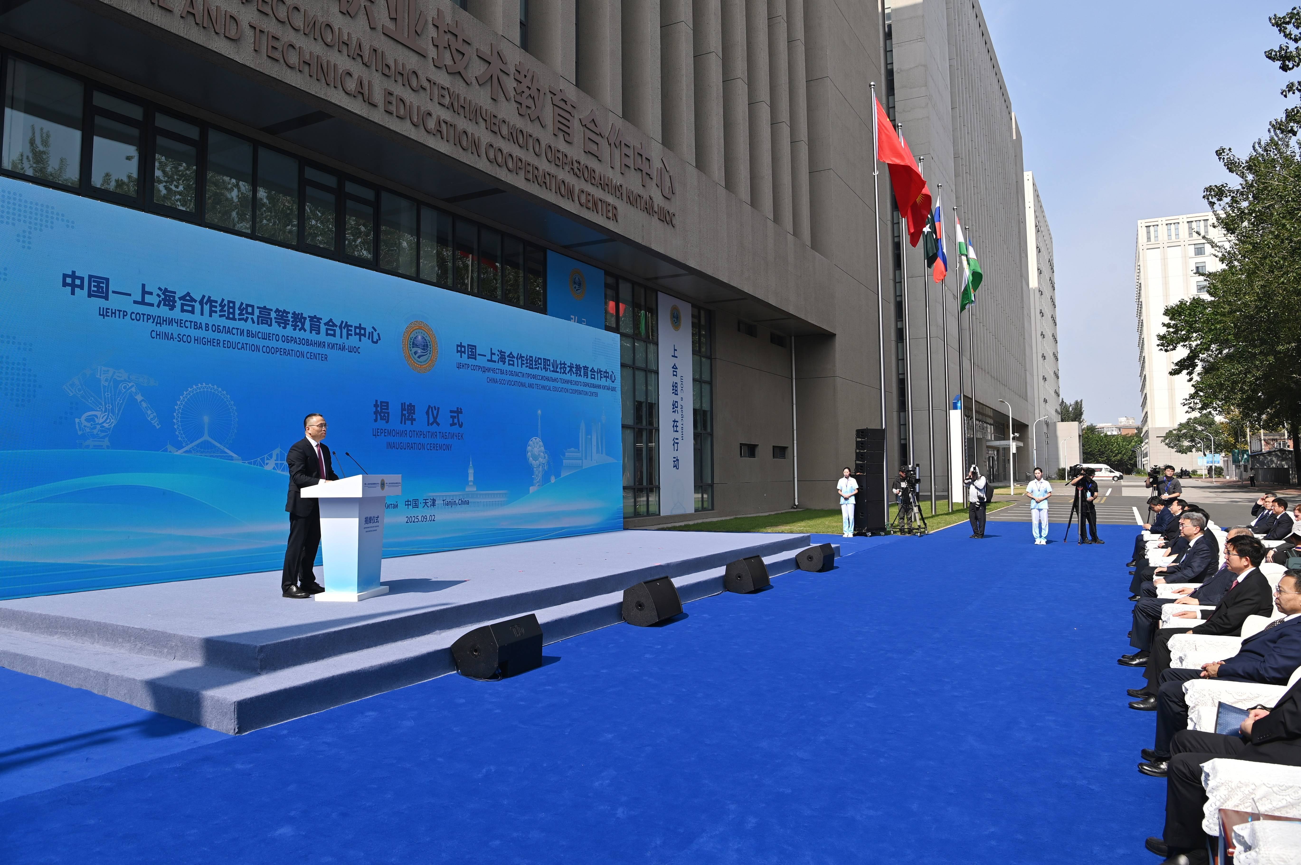 这是9月2日拍摄的中国—上海合作组织职业技术教育合作中心揭牌仪式现场。新华社记者 李然 摄在天津揭牌成立的2个平台、1个中心已设立具体的工作架构,包括执行委员会等决策机构、秘书处等协调推进和发展规划机构以及促进中心等推动务实合作,并设置了实体化载体,配置专职人员。